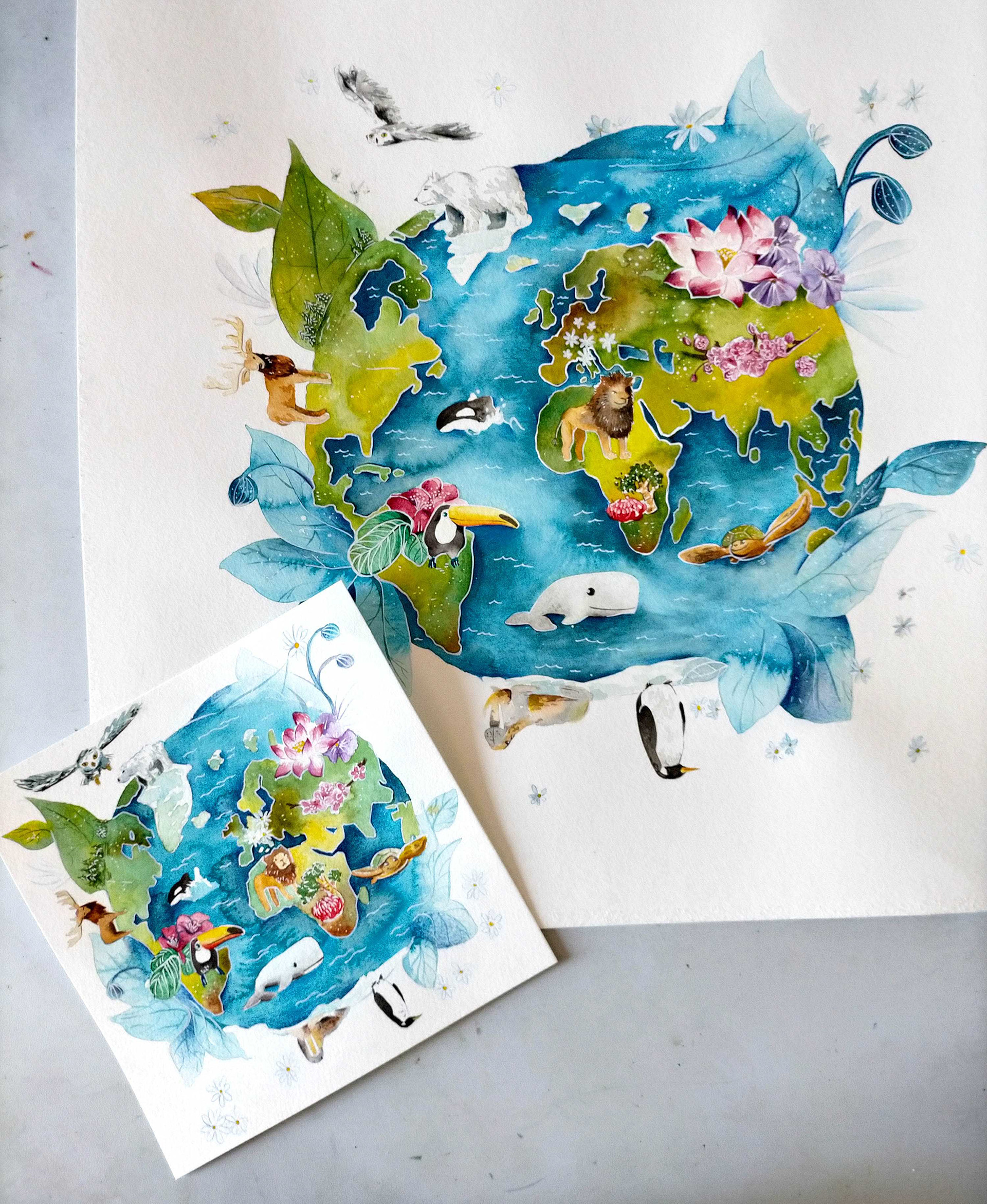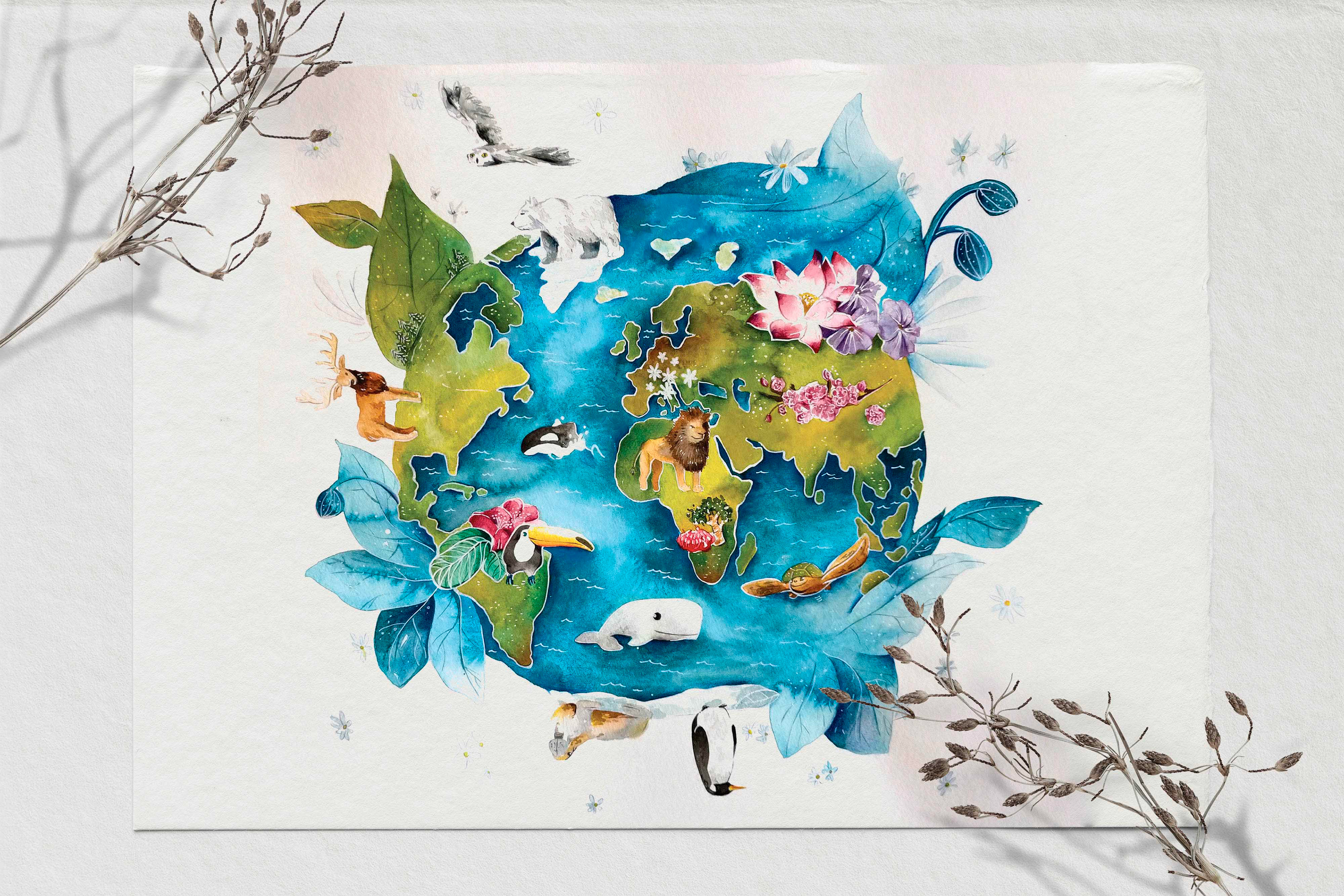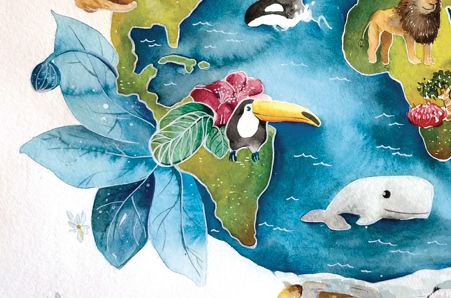 L’immagine costruisce un mondo illustrato popolato da animali e elementi naturali, in cui fiori e creature si intrecciano in una scena ricca e colorata, pensata per essere esplorata con lo sguardo.